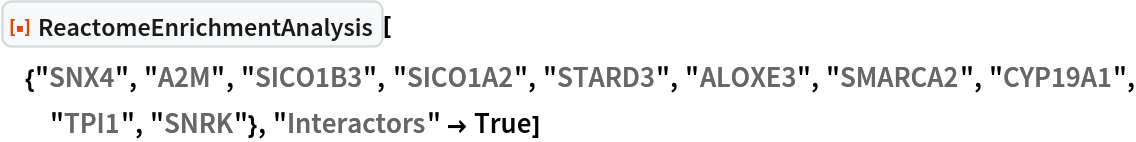 "ReactomeEnrichmentAnalysis"][{"SNX4", "A2M", "SICO1B3", "SICO1A2", "STARD3", "ALOXE3", "SMARCA2", "CYP19A1", "TPI1", "SNRK"}, "Interactors" -> True]