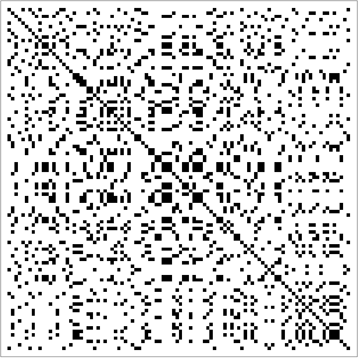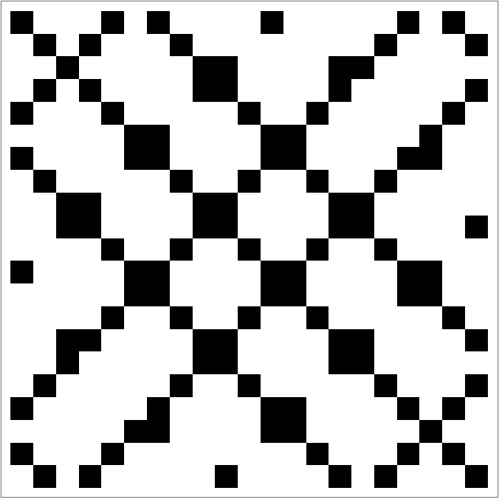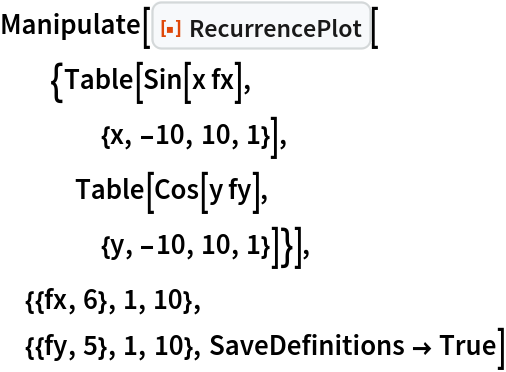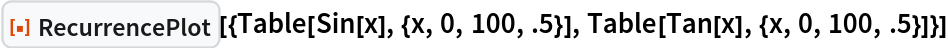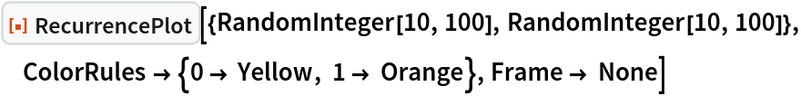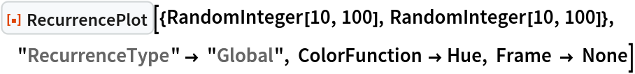 ResourceFunction["RecurrencePlot"][{ts1,ts2}] shows the recurrence plot for a pair of time series. |