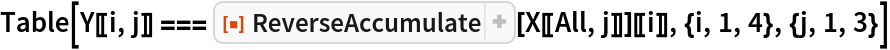 Where the argument is a nested list, X, ReverseAccumulate creates a nested list Y of similar dimension in which Y[[i,j]]=ReverseAccumulate[X[[All,j]]][[i]]: