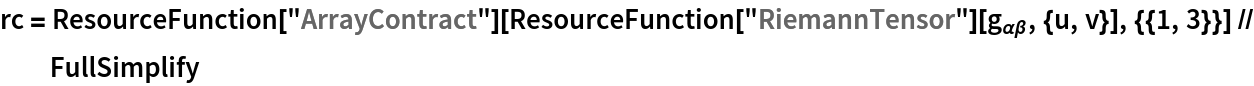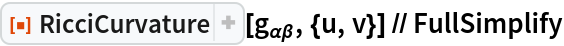 ResourceFunction["RicciCurvature"][m,{u,v}] computes the components of the Ricci curvature for a metric. |