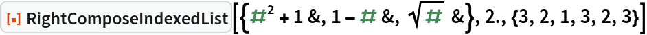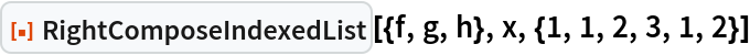 ResourceFunction["RightComposeIndexedList"][{f1,f2,f3,…},x,{i,j,k,…}] gives {x,fi[x],fj[fi[x]],fk[fj[fi[x]]],…}. |