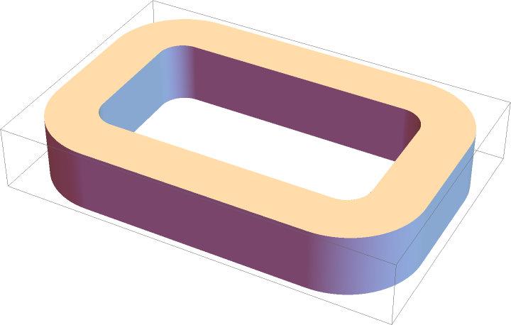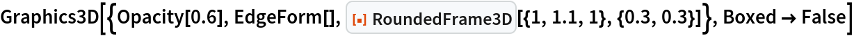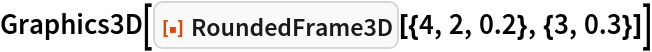ResourceFunction["RoundedFrame3D"][{dx,dy,dz}] represents a 3D frame with dimensions {dx,dy,dz}. | |
