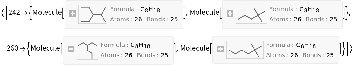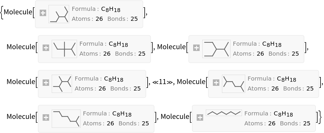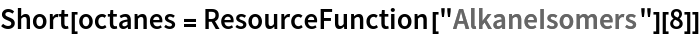 Generate all alkanes with 8 carbon atoms (octanes) using the resource function AlkaneIsomers: