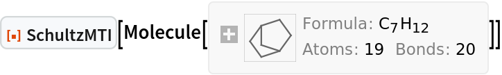 ResourceFunction["SchultzMTI"][mol] computes the Schultz index of the molecule mol. |