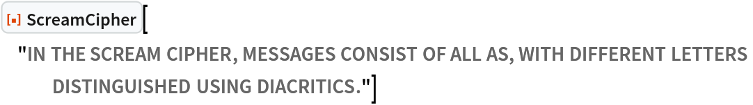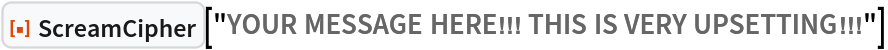 ResourceFunction["ScreamCipher"][string] gives the Scream cipher for the given string. |