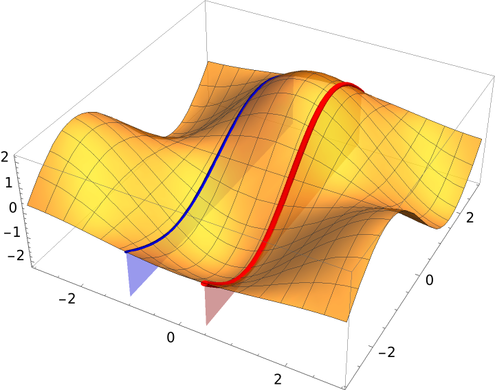 2 Sin[y] Cos[x], {x, -3, 3}, {y, -3, 3}, "XSection" -> {-1, 1/2}, "XSectionStyle" -> {{Tube[.03], Blue}, {Tube[.06], Red}}]