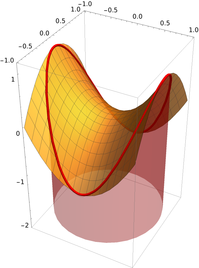 x^2 - y^2, {x, -1, 1}, {y, -1, 1}, {Cos[t], Sin[t]}, {t, 0, 2 \[Pi]},