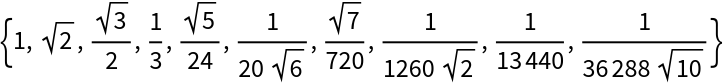 Get the measure of the first 10 standard simplices: