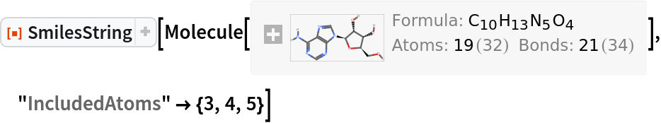 The "IncludedAtoms" option allows finding the SMILES string for a molecule fragment. The value of the option should be All or a list of atom indices: