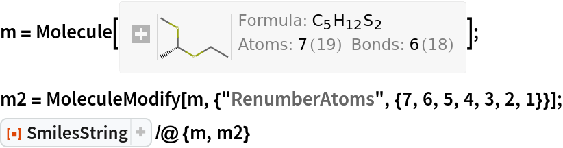 Two equivalent molecules will give the same SMILES string even if their atom ordering is different: