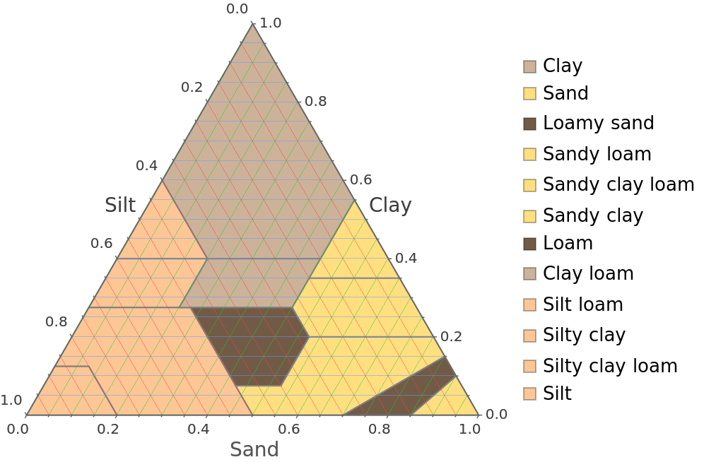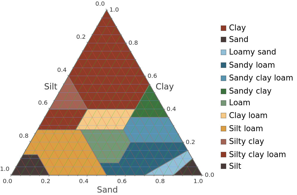 Plot the soil texture diagram with custom grid lines, following the grid line specification conventions of TernaryListPlot: