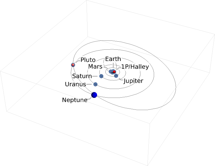 ResourceFunction["SolarSystemPlot3D", ResourceVersion->"5.1.1"][{Blue, Sphere[Entity["Planet", "Neptune"], 2], Pink, Sphere[Entity["MinorPlanet", "Pluto"], 1], Red, Sphere[Entity["Comet", "Comet1PHalley"], 1]}, DateObject[{1986, 1, 3}, "Day", "Gregorian", -6.`]]