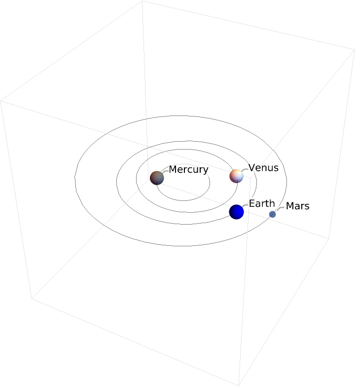 ResourceFunction["SolarSystemPlot3D", ResourceVersion->"5.1.1"][{Blue, Sphere[Entity["Planet", "Earth"], .1], White, Sphere[Entity["Planet", "Venus"], .1], Gray, Sphere[Entity["Planet", "Mercury"], .1]}, "IncludeSun" -> False, PlotRange -> 1.7]