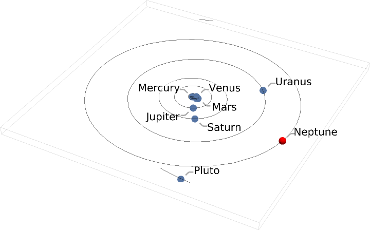 ResourceFunction["SolarSystemPlot3D", ResourceVersion->"5.1.1"][{Blue, Sphere[Entity["Planet", "Neptune"], 1]}, "OrbitStyle" -> Red]