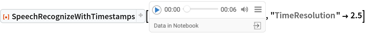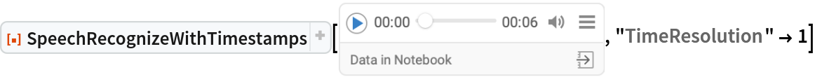 ResourceFunction["SpeechRecognizeWithTimestamps"][audio] recognizes speech in audio and returns it as a list of {time, string} pairs. |