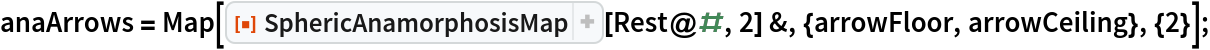 anaArrows = Map[ResourceFunction["SphericAnamorphosisMap"][Rest@#, 2] &, {arrowFloor, arrowCeiling}, {2}];
