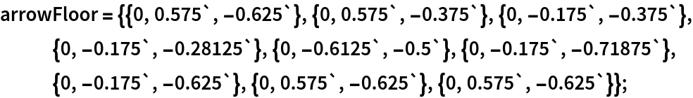 arrowFloor = {{0, 0.575`, -0.625`}, {0, 0.575`, -0.375`}, {0, -0.175`, -0.375`}, {0, -0.175`, -0.28125`}, {0, -0.6125`, -0.5`}, {0, -0.175`, -0.71875`}, {0, -0.175`, -0.625`}, {0, 0.575`, -0.625`}, {0, 0.575`, -0.625`}};