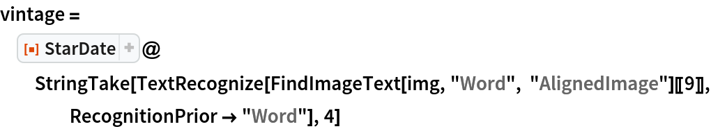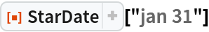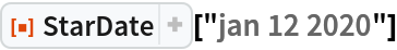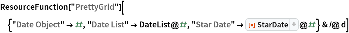 ResourceFunction["StarDate"][date] returns a StarDate string representing the given date object. |