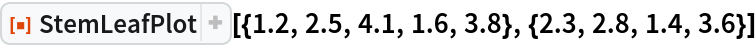 ResourceFunction["StemLeafPlot"][data1,data2] creates a side-by-side stem-and-leaf plot for the vectors data1 and data2. |