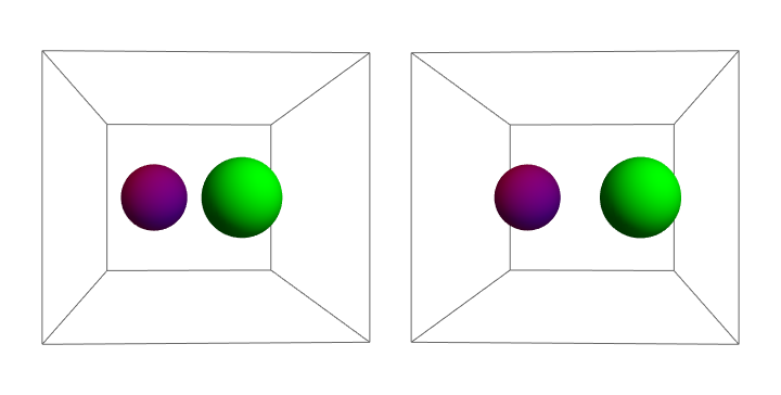 Use depth perception to infer that the purple ball is closer to the camera than the green ball: