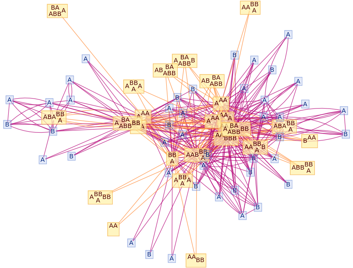 The branchial graph for a glocal multiway system shows the branch pair (i.e. critical pair) ancestry for a glocal evolution causal graph/token event graph. Unlike the branchial graph for an ordinary (global) multiway system, which only contains information regarding the evolution ancestry of states, glocal branchial graphs contain information about both the causal ancestry of events and the evolution ancestry of states/tokens.