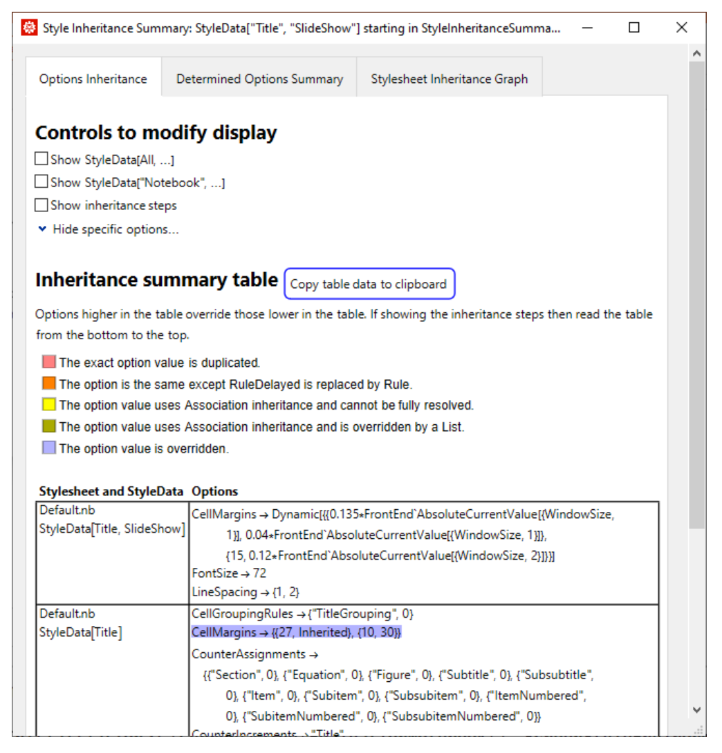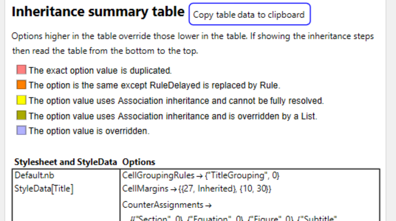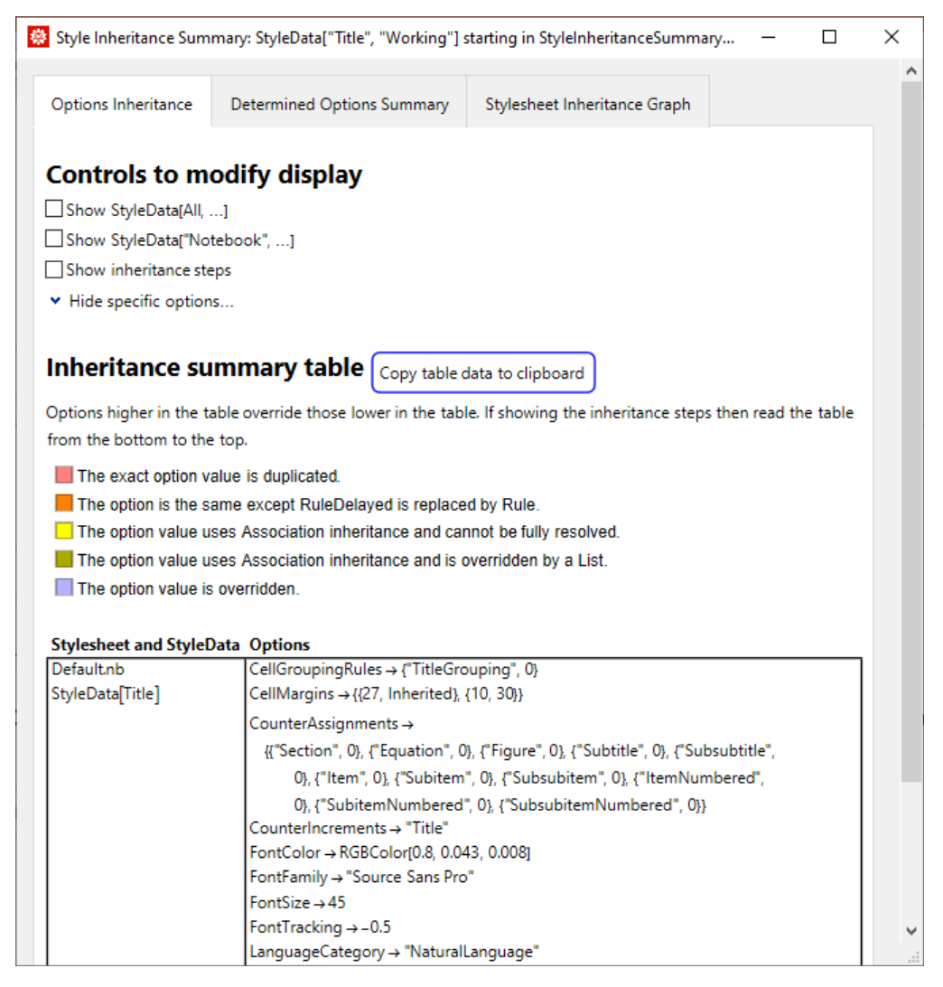 ResourceFunction["StyleInheritanceSummary"] includes additional details explaining how the results are gathered along with the stylesheet inheritance order.
