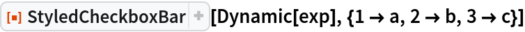 ResourceFunction["StyledCheckboxBar"][x,{val1,val2 ,val3…}] represents a styled checkbox bar with setting x and with checkboxes for values vali to include in the List x. | |