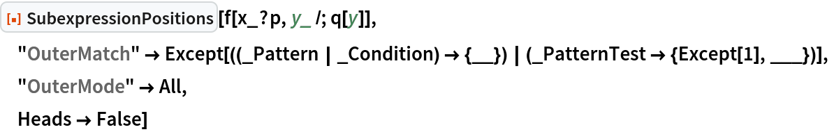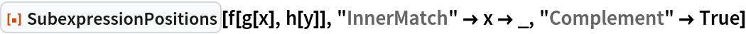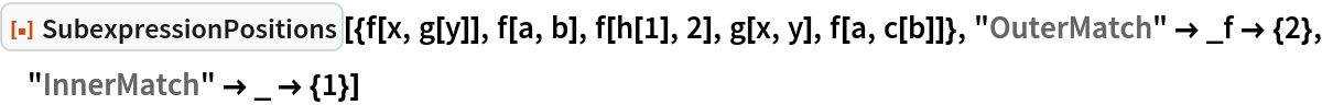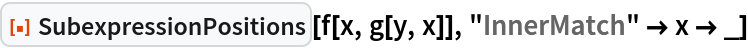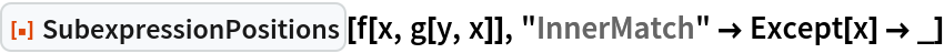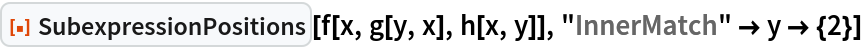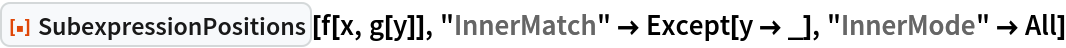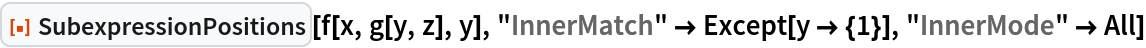 Find subexpressions having all inner expressions matching a given pattern. Positions {2} and {2, 1} of expressions g[y] and y respectively are not present due to both having inner expression matching y: