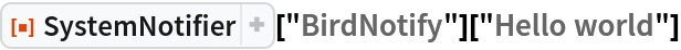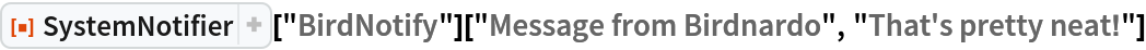 ResourceFunction["SystemNotifier"][…][message] generates a system notification displaying the text specified in message. | |