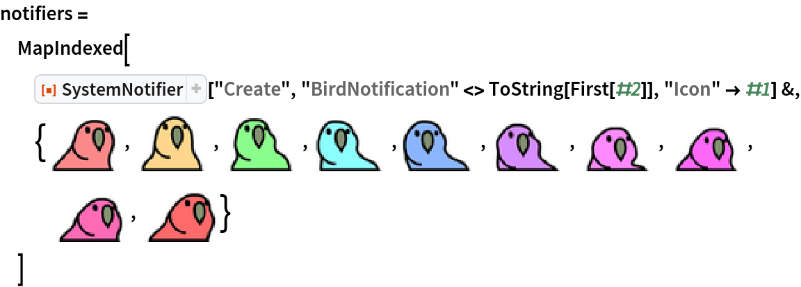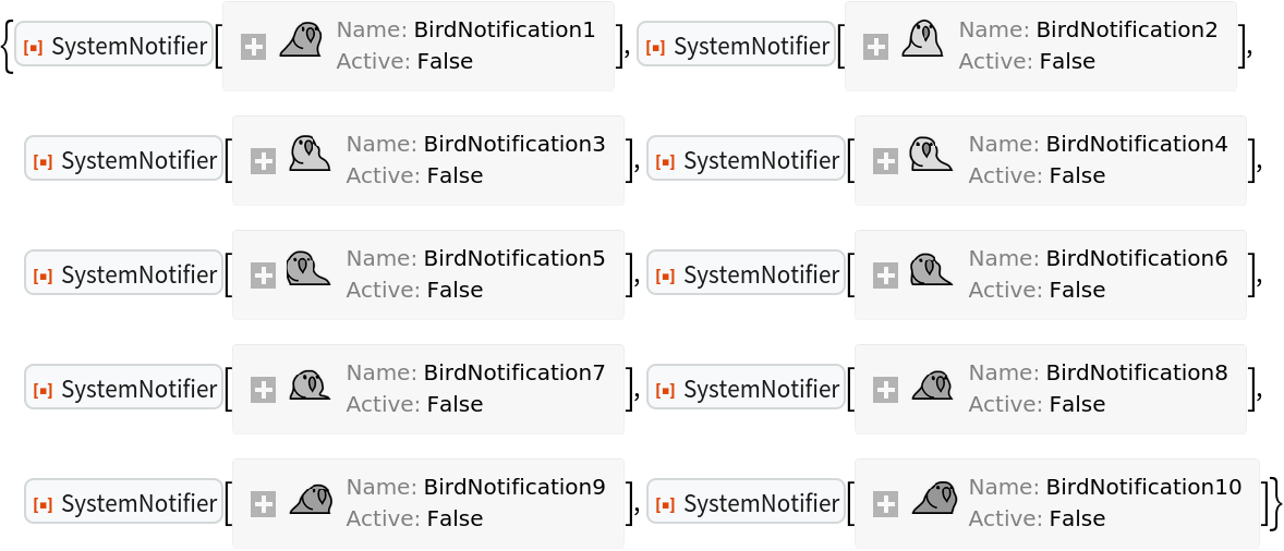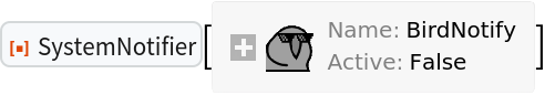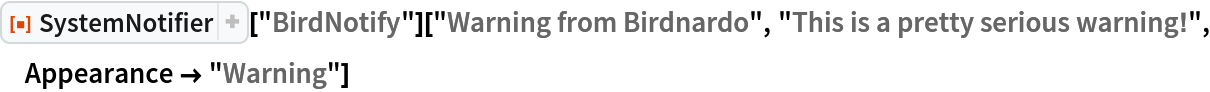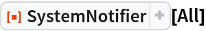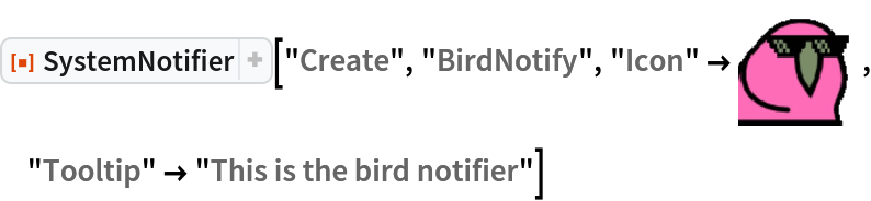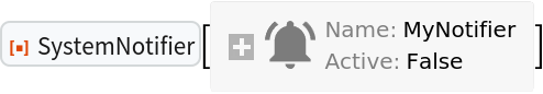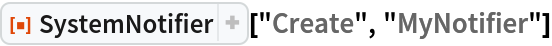 ResourceFunction["SystemNotifier"]["Create","name"] creates a ResourceFunction["SystemNotifier"] object with the given "name". | |