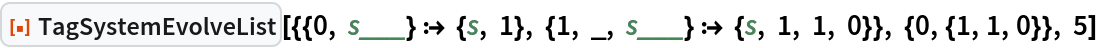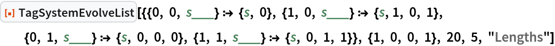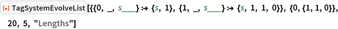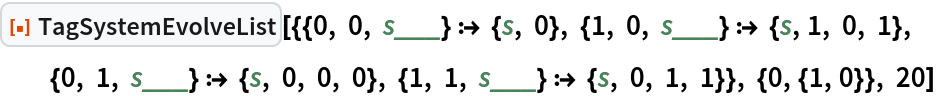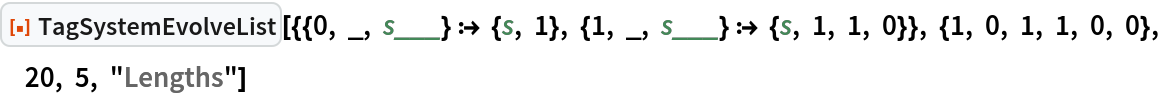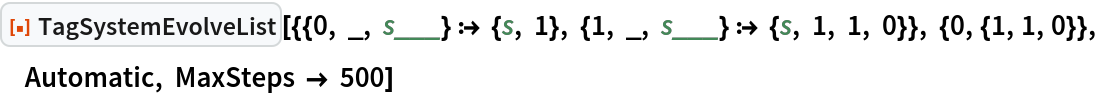 ResourceFunction["TagSystemEvolveList"][rules,init,t] returns the list of states attained from evolving init using tag system rules over t steps. | |