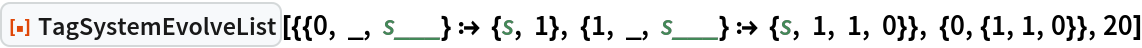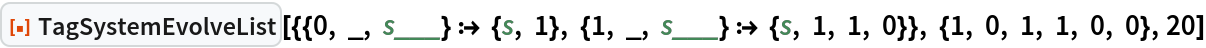 Perform a tag system evolution with specified rules, initial condition, and number of evolution steps: