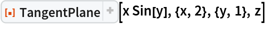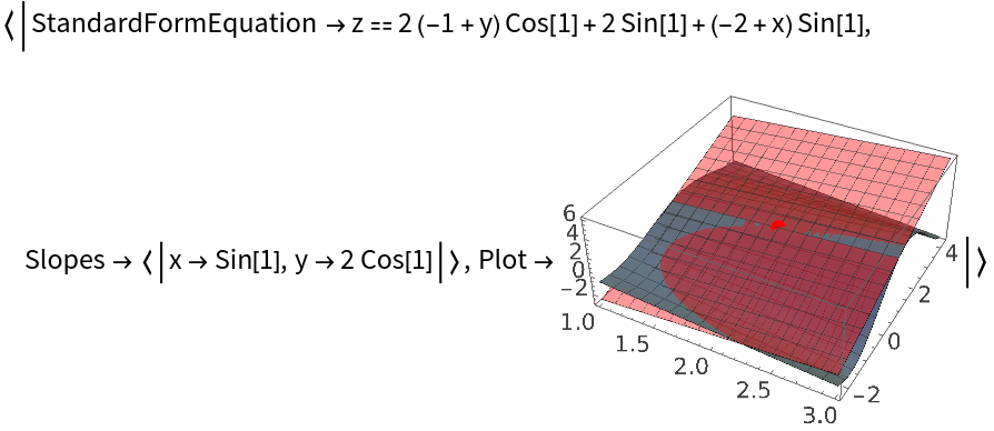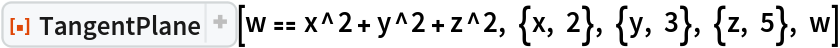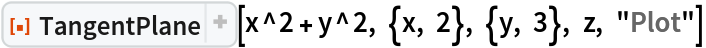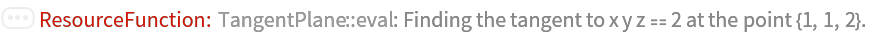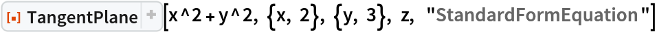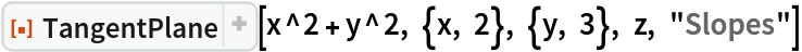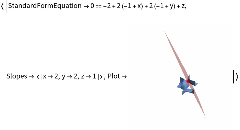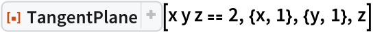 ResourceFunction["TangentPlane"][expr,{x,a},{y,b},z] returns an association of properties of the tangent plane to expr, viewed as an equation in x,y and z, at the point x=a,y=b. | |