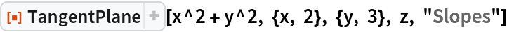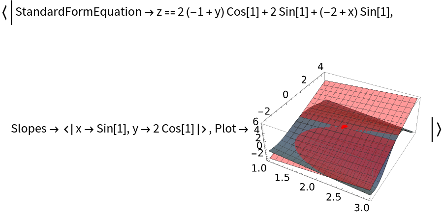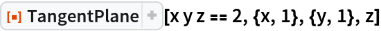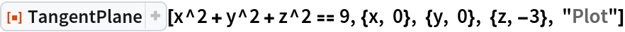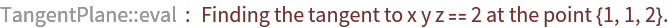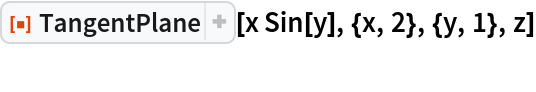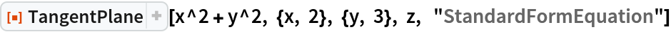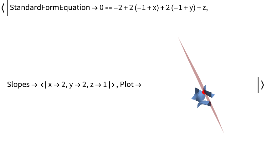 ResourceFunction["TangentPlane"][expr,{x,a},{y,b},z] returns an association of properties of the tangent plane to expr, viewed as an equation in x,y and z, at the point x=a,y=b. | |