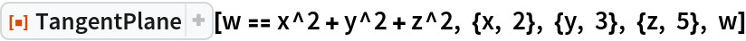 ResourceFunction["TangentPlane"][expr,{x,a},{y,b},{z,c},w] returns properties of a tangent plane in four dimensions. | |