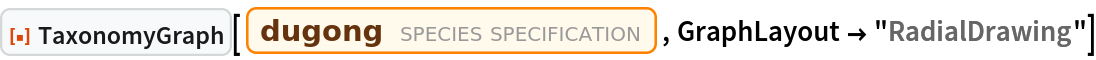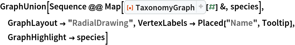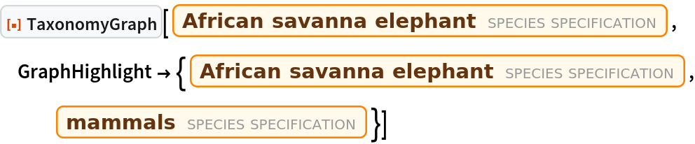 ResourceFunction["TaxonomyGraph"][species] visualizes the taxonomy graph for a specified species entity. |