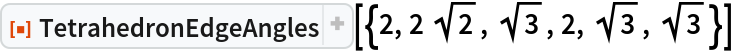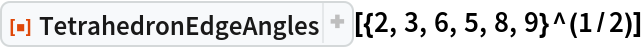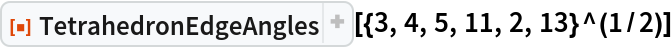 ResourceFunction["TetrahedronEdgeAngles"][{a,b,c,d,e,f}] returns the angles opposite edges (a,b,c,d,e,f). |