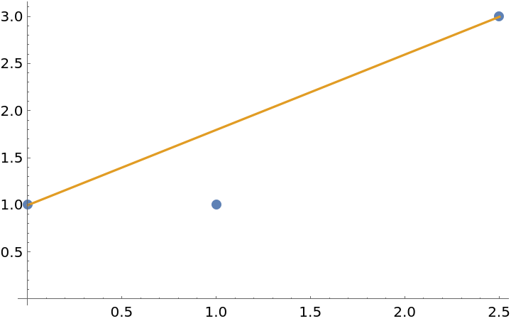 Fit a line through the points (0,1),(1,1),(2.5,3) using the Theil–Sen estimator: