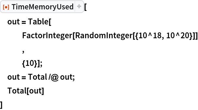 ResourceFunction["TimeMemoryUsed"][expr] evaluates expr, returning a list of the absolute number of seconds in real time that have elapsed, the maximum number of bytes used and the result. |