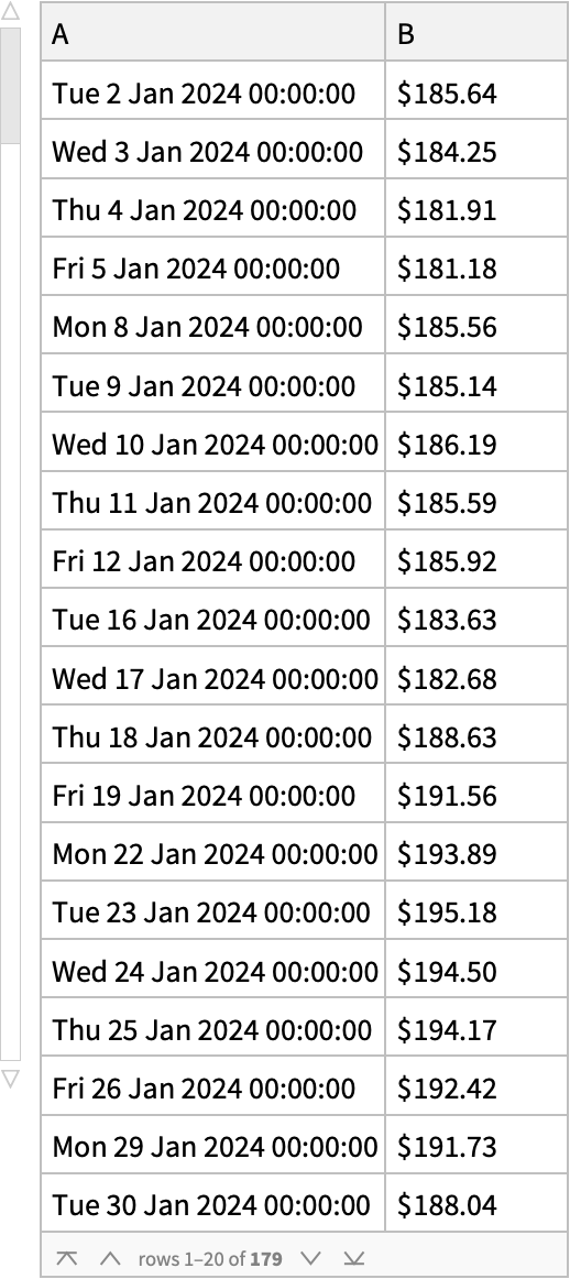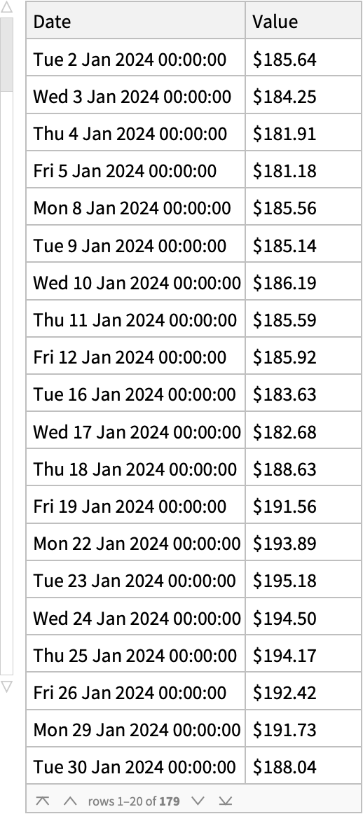 "AAPL", {DateObject[{2024, 1, 1}, "Day"], DateObject[{2024, 9, 18}, "Day"]}]