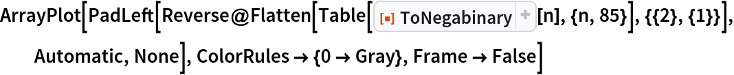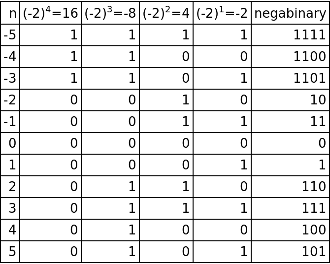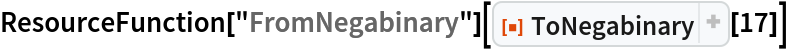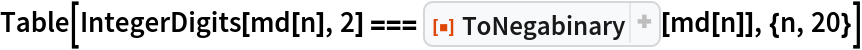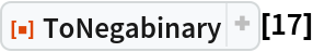 ResourceFunction["ToNegabinary"][n] gives the negabinary representation of the integer n. |