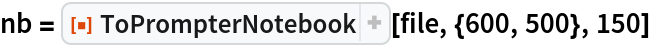 ResourceFunction["ToPrompterNotebook"][name, {width, height}, wpm] converts a notebook with the specified name to a prompter notebook of width and height for the given speaking rate in words per minute. |