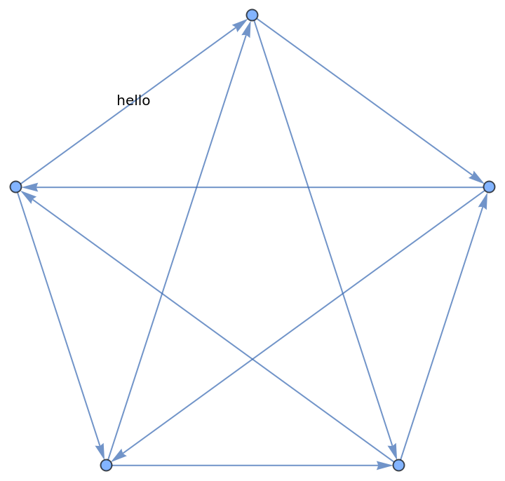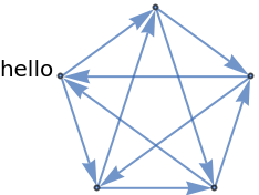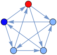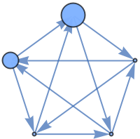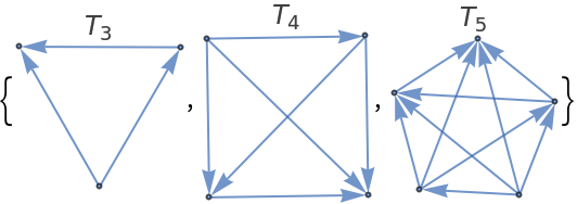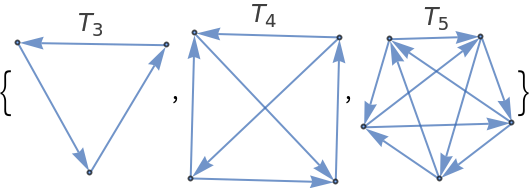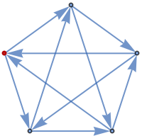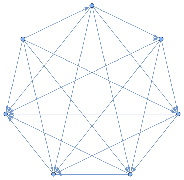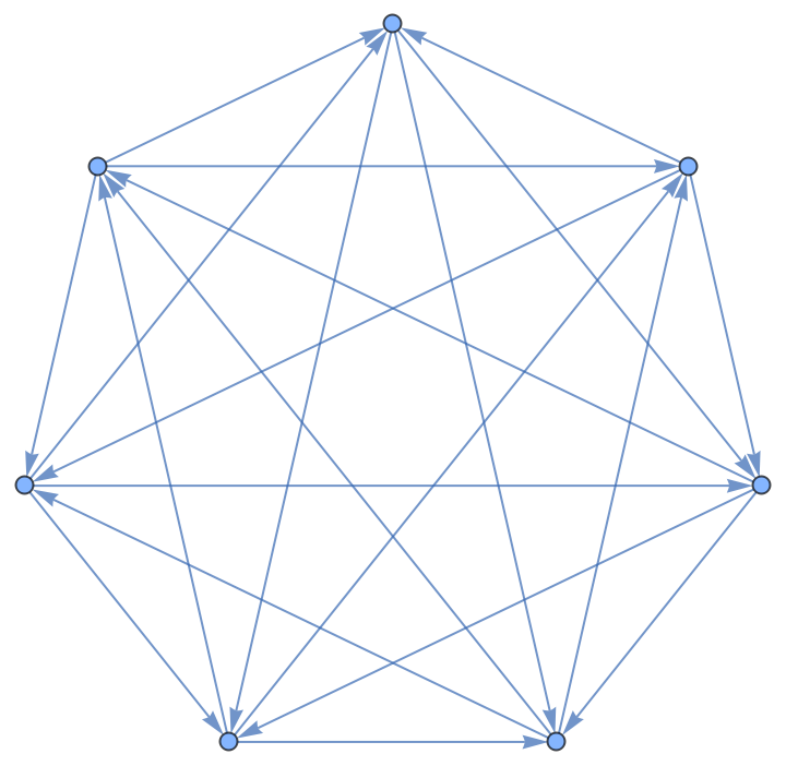 ResourceFunction["TournamentGraph"][n] generates a balanced directed tournament on n vertices in which each vertex has nearly the same number of outgoing and incoming edges. | |
