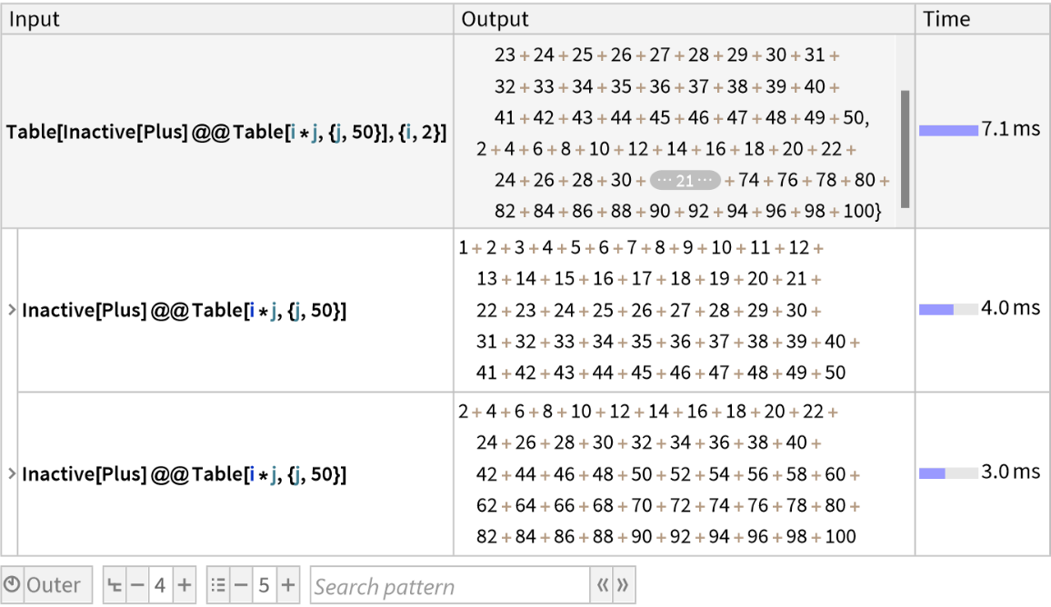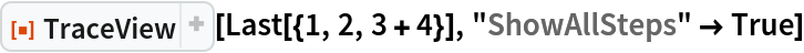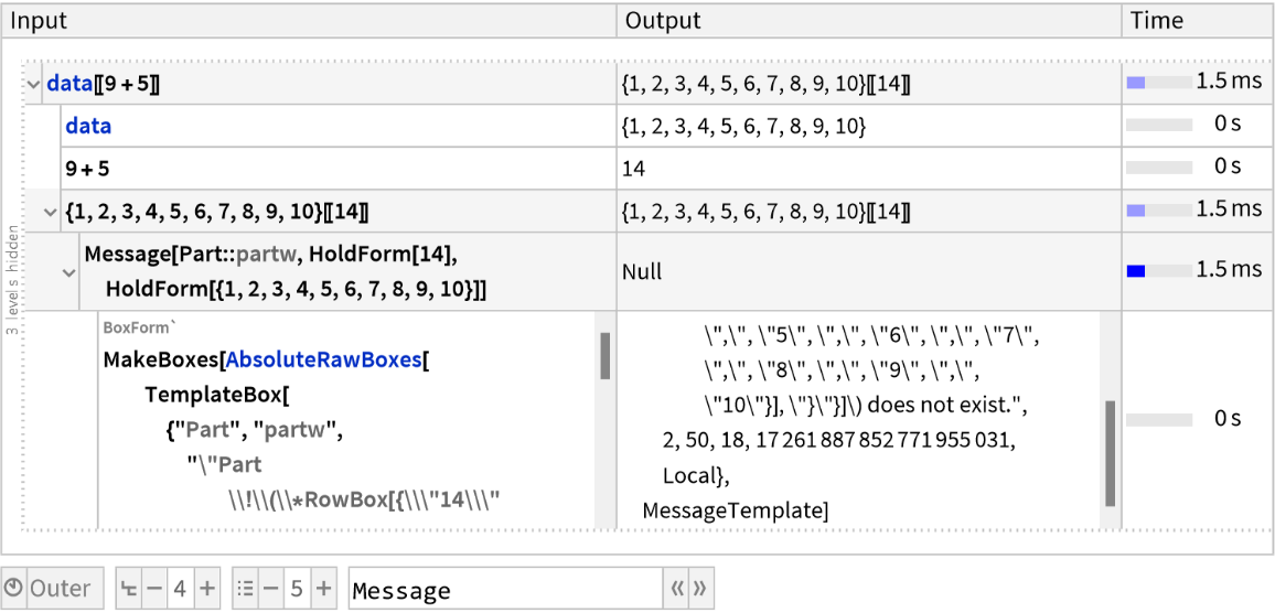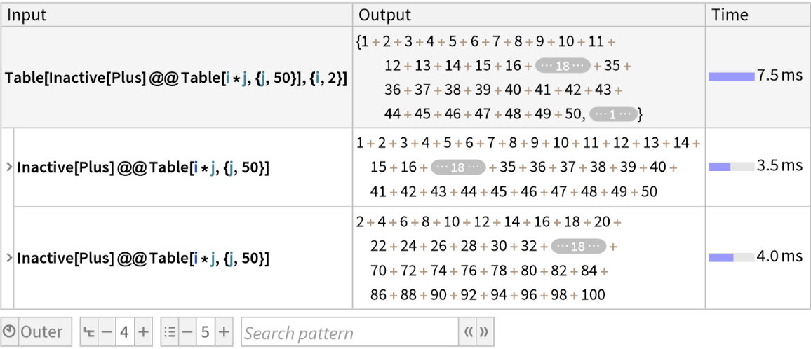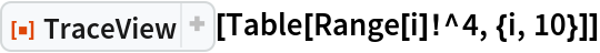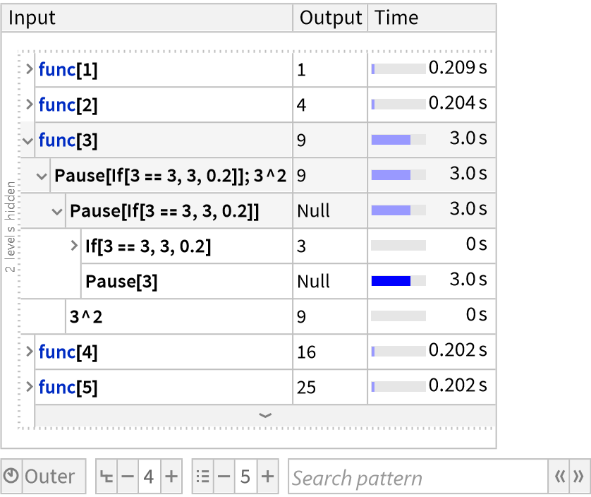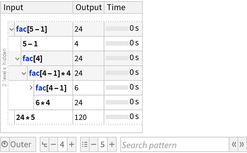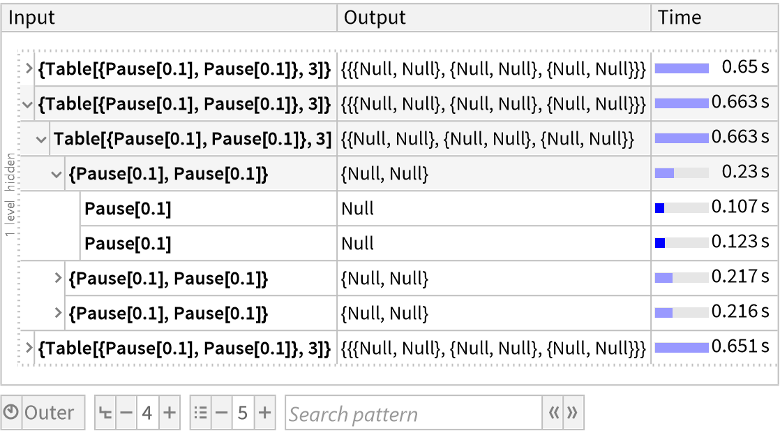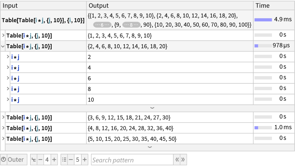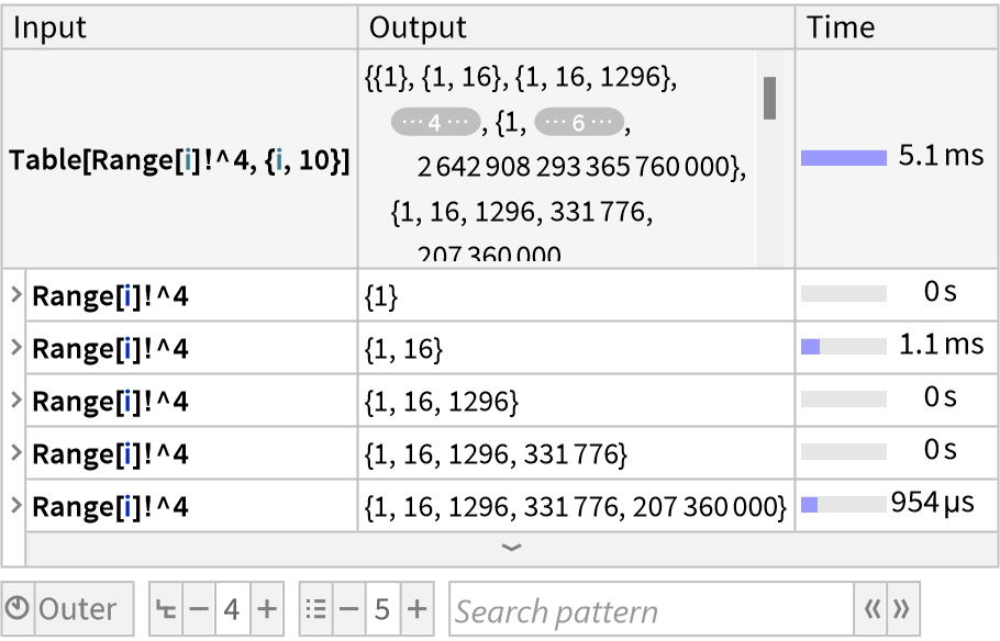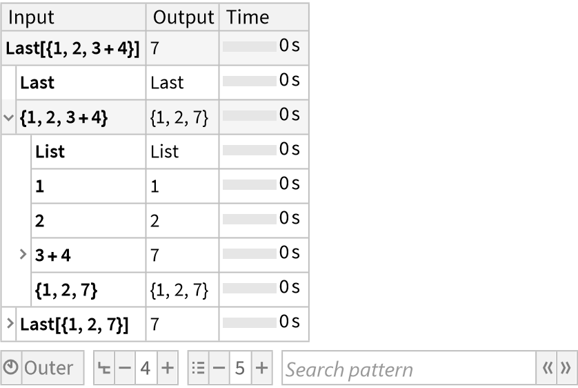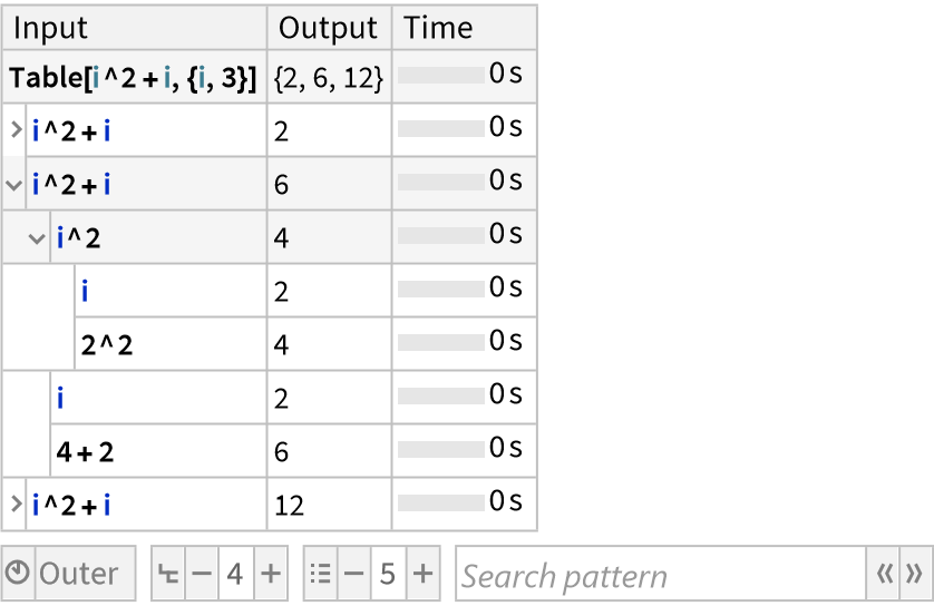 ResourceFunction["TraceView"][expr] displays an interactive view of the execution trace of the evaluation process of expr. Shown are the input and output expressions, their sub-steps, as well as the time taken by each step.