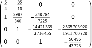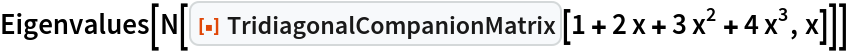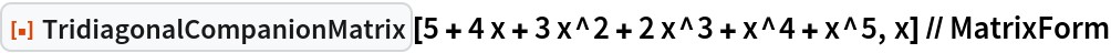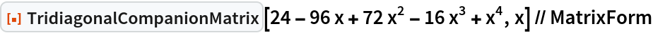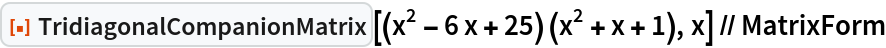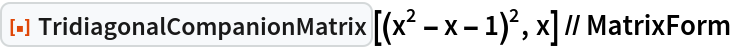 ResourceFunction["TridiagonalCompanionMatrix"][poly,x] gives a tridiagonal companion matrix of poly, treated as a polynomial in x. |