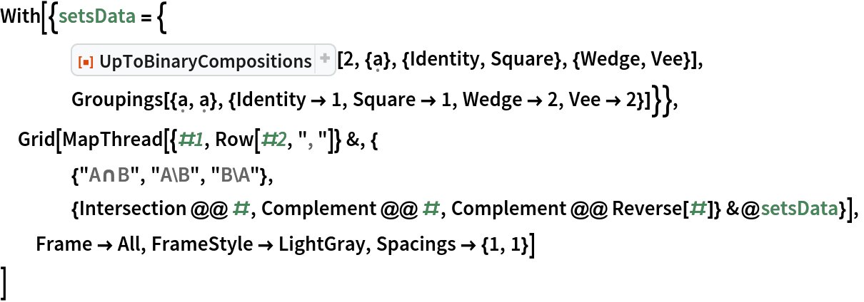Compare UpToBinaryCompositions with Groupings by treating outputs as sets (A and B respectively):