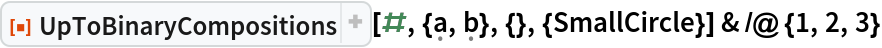ResourceFunction["UpToBinaryCompositions"][leafn,sym,unaries,binaries] returns all possible compositions of symbols listed in sym by unary and binary functions listed in unaries and binaries, whose proper leaf count (terminal nodes only) equals leafn. |