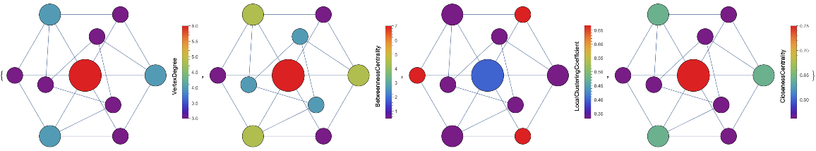 VertexSizeScaledGraph of the GolombGraph with vertices colored by different measures and custom ColorFunction: