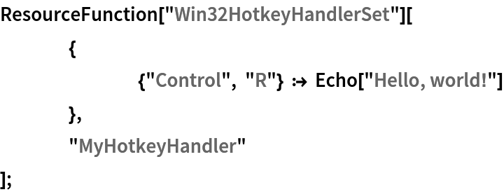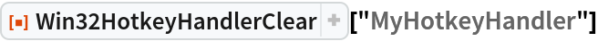 ResourceFunction["Win32HotkeyHandlerClear"][name] clears a previously set hotkey handler. |