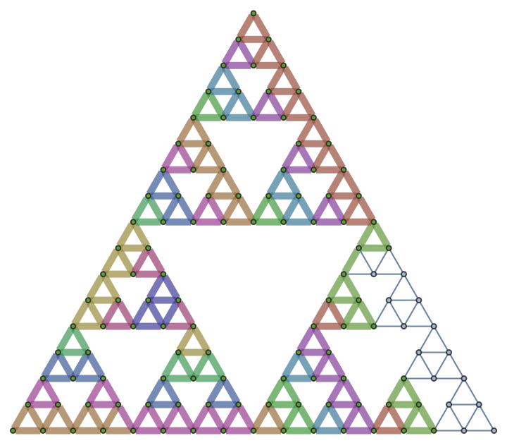 WolframHausdorffDimension also supports dimension computations in graphs with non-integer dimensionality, such as this Sierpinski sieve graph: